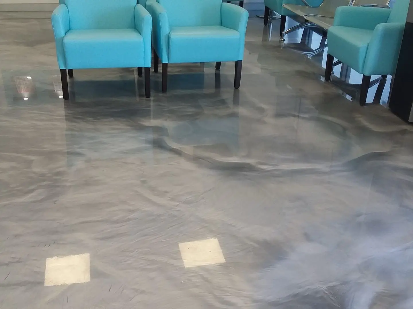 Metallic Marble™ is an easy to clean, seamless and one-of-a-kind flooring solution designed to withstand heavy foot traffic and other wear and tear. The finished look is a designer look that has a high gloss factor and a glass-like finish with subtle reflective sparkle.