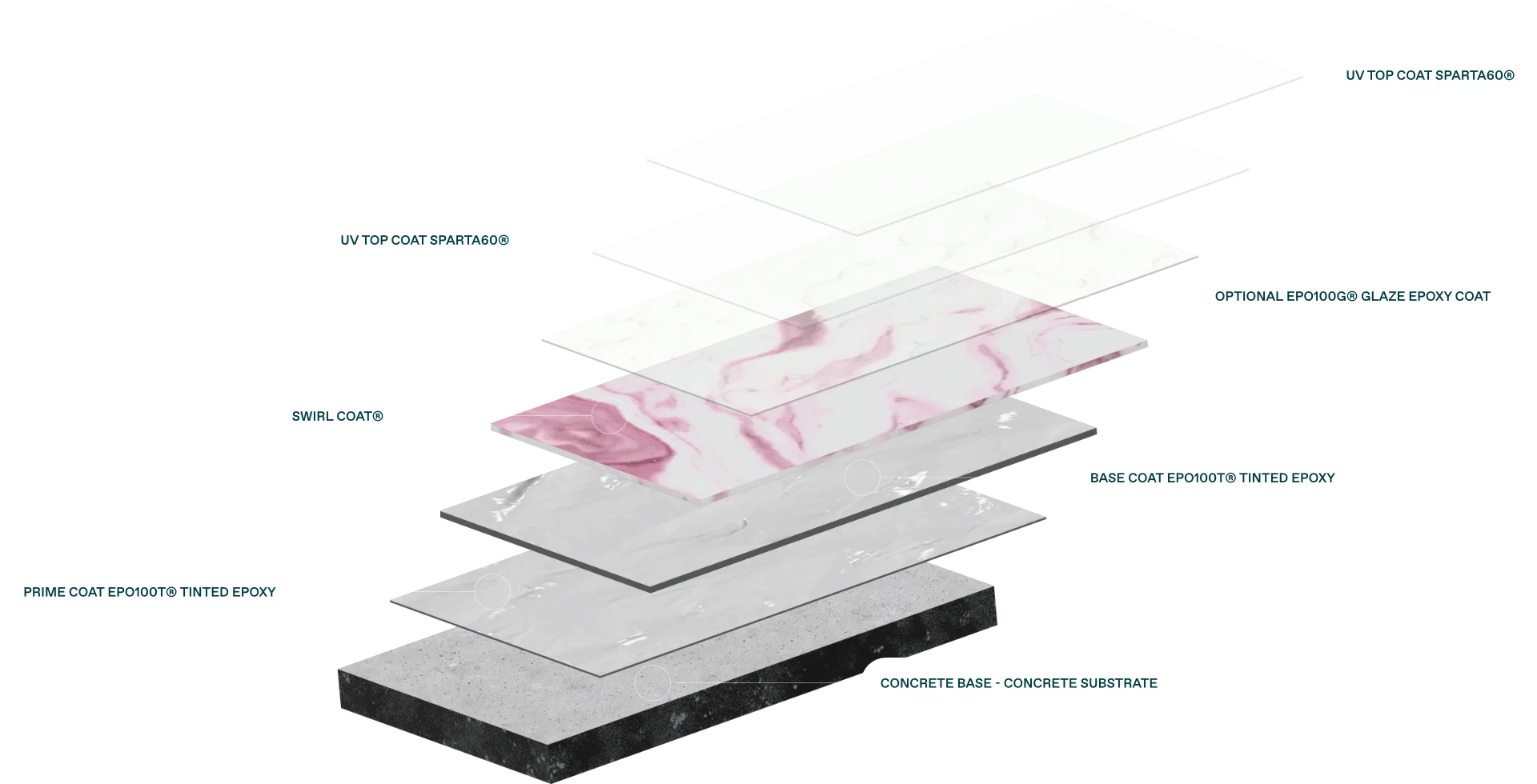 The Swirl Coat System is created using multiple colours of EPO100T® Tinted Epoxy, applied directly to the floor to form swirls and movement that resemble a marbled pattern. You can blend and layer the tints however you like – it’s all about creativity and technique. Swirl Coat is a popular choice for interior spaces, offering a luxurious, modern aesthetic.
